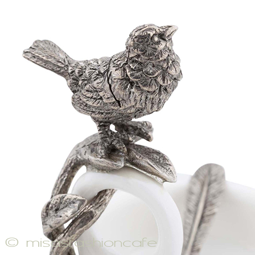 商品: 2スプーン付き調味料皿。 デザイン: bird (小鳥)。 材質:ピューター(シルバー)・磁器。 サイズ:10.5cm・スプーン5cm。
