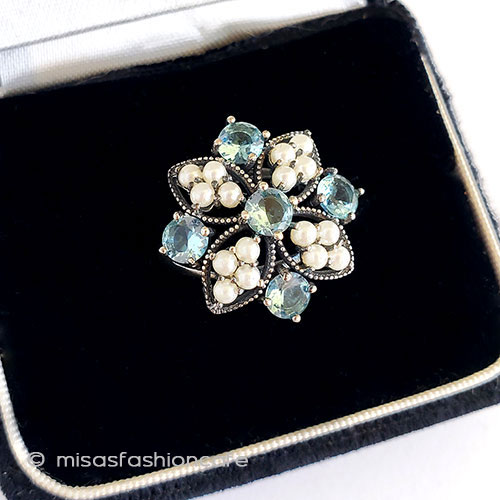 デザイン:アクアマリン&パールのフラワー透かし銀装飾。
