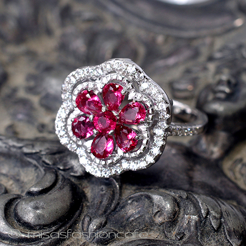 デザイン:ルビーとホワイトトパーズ装飾透かしフラワー。