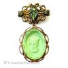 商品: ブローチ。 デザイン: ぺリドットグリーンのガラス・カメオ。 サイズ: 8cmx4.3cm。 状態: 大変綺麗なエクセレントコンディションです。