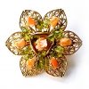商品: ブローチ。 デザイン:珊瑚&天然ペリドット装飾透かしGoldの花。 サイズ: 4.4cm。 状態: 大変綺麗なエクセレントコンディションです。