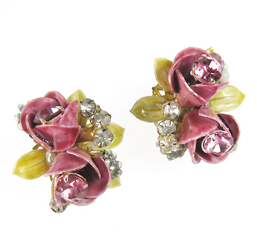 商品: イヤリング。 ブランド: Robert ロバート (刻印あり)。 デザイン: 爪留めクリスタル&エナメル装飾フラワー。 サイズ: 2.7cm。 状態: 大変良いVintageコンディションです。